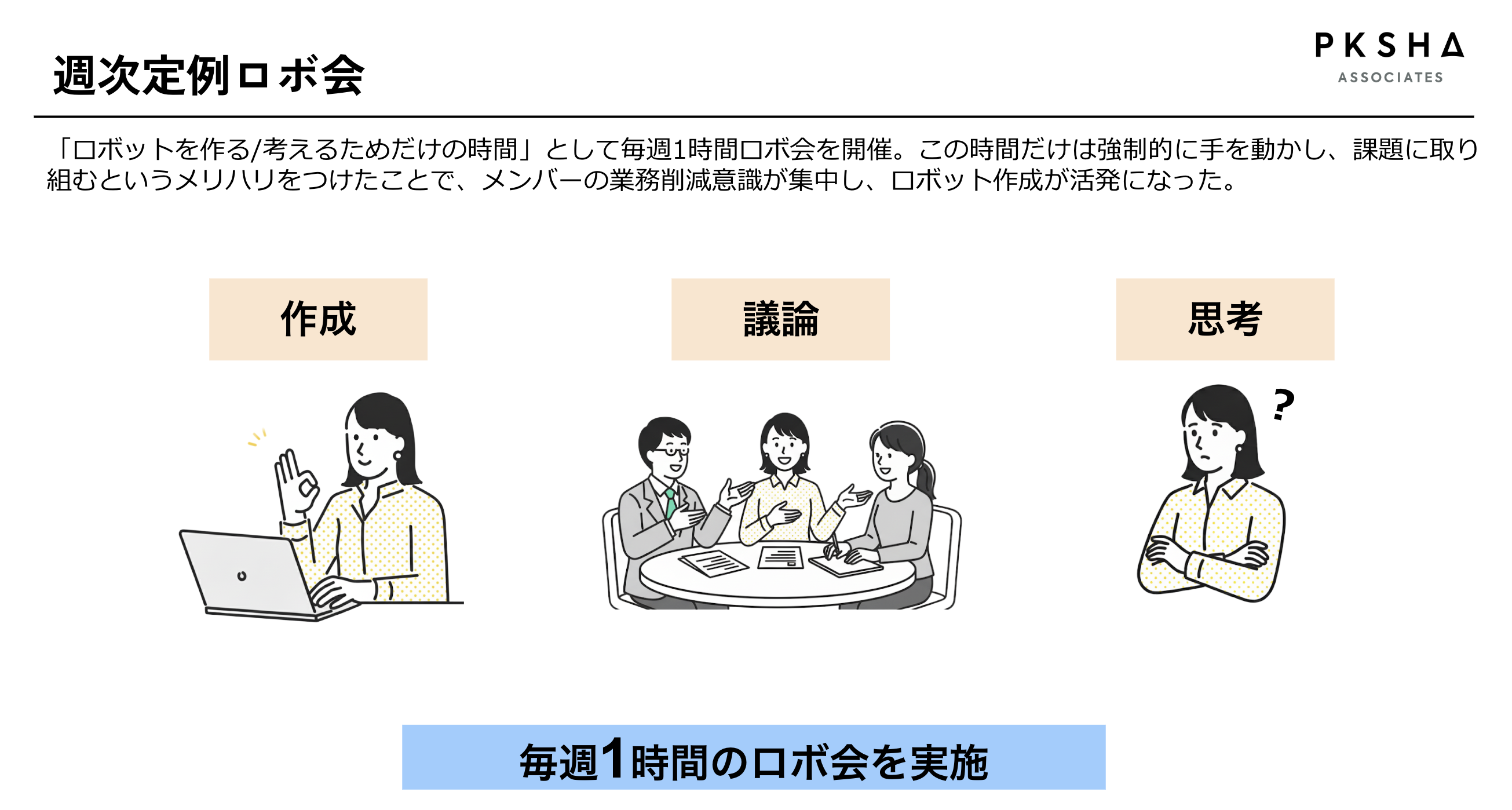 しかし、今年の前半は一度停滞してしまったんです。「ロボットを作りたい」という意識はあっても、日常業務に戻ると、なかなかそのための時間を取れない日々が続いていました。そこで、PKSHAさんのカスタマーサクセス担当者様のアドバイスを受け、現在は「ロボ会」という時間を設けています。