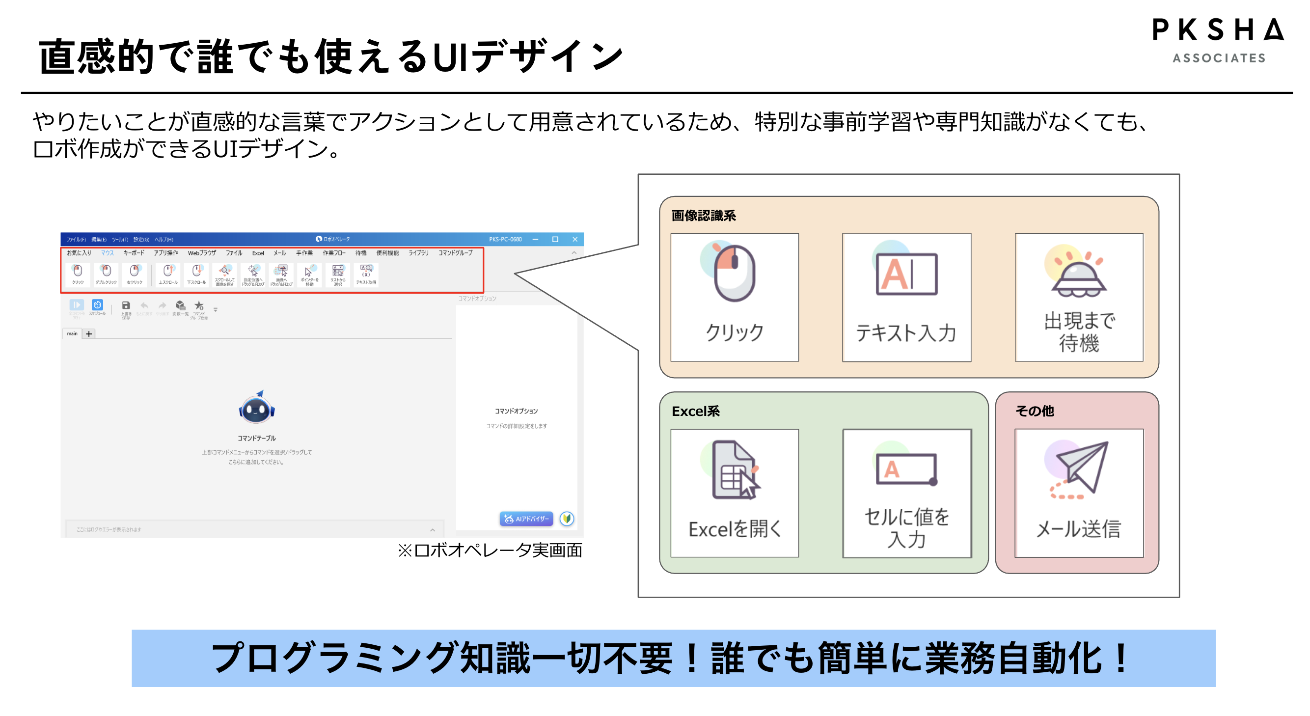 その点、ロボオペレータは「画像をクリックする」「画像が見つかるまで待つ」といった、やりたいことが直感的な言葉でアクションとして用意されているので、特別な事前学習や専門知識がなくても、簡単なロボットならすぐに構築できてしまうと感じました。