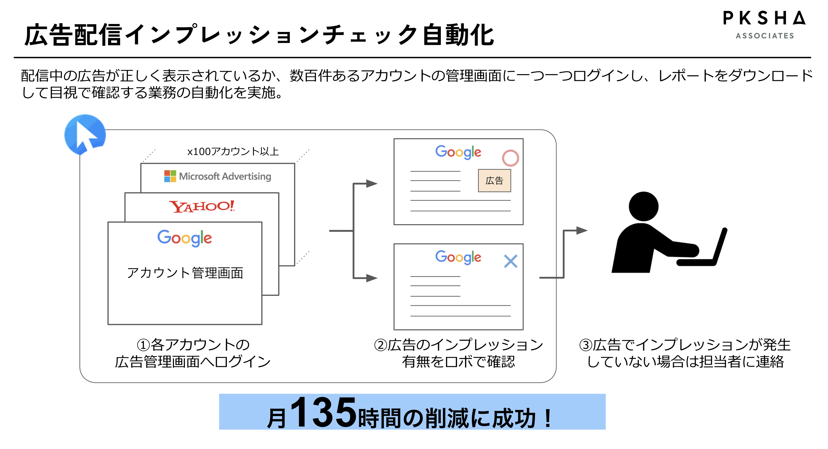 最も効果が大きかったのは、広告配信の「インプレッションチェック」という業務を自動化したロボットです。これ一つで月間約135時間の工数を削減できています。
