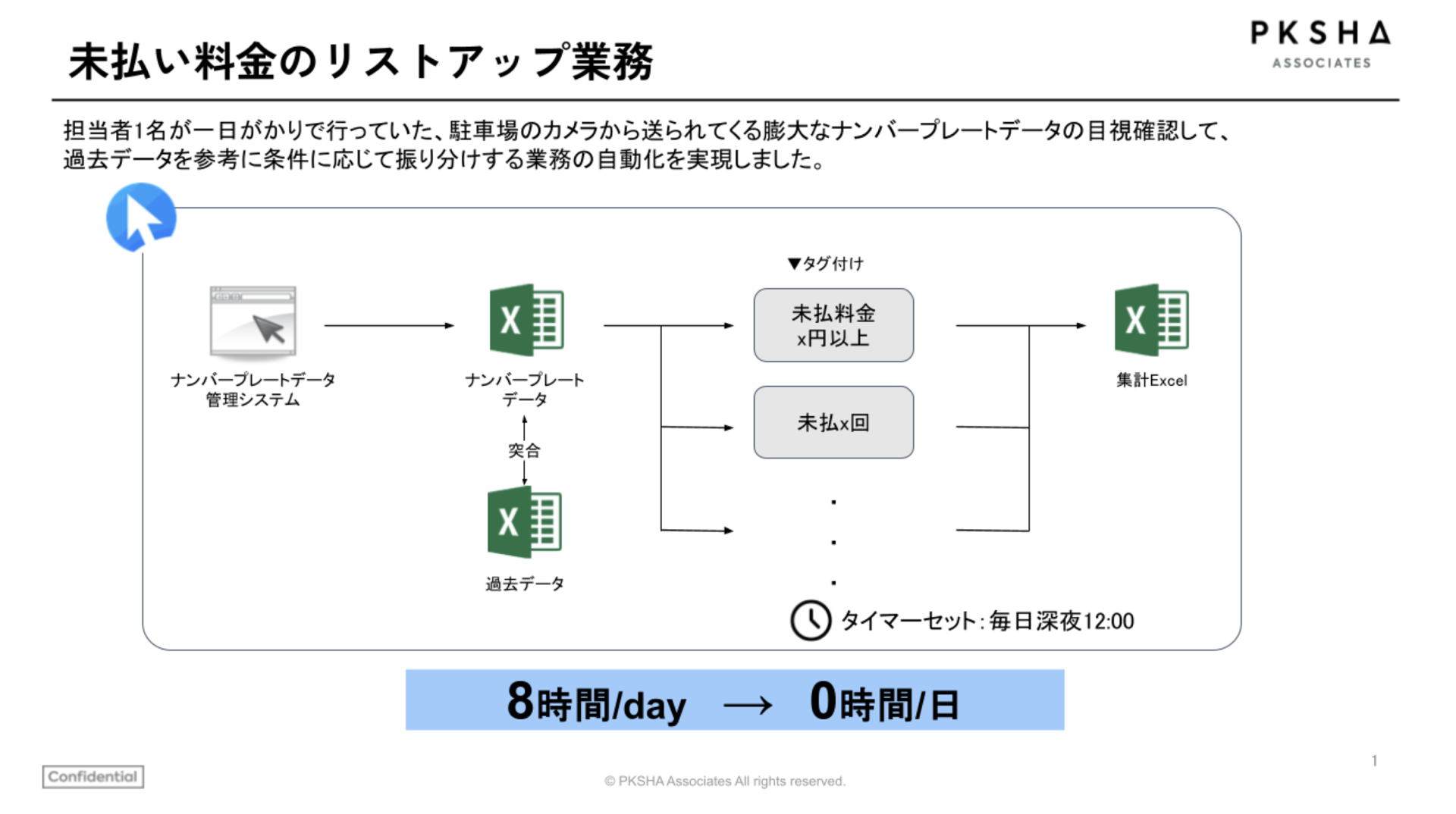 担当者1名が、駐車場のカメラから送られてくる膨大なナンバープレートデータのうち、アルゴリズムで抽出された一部データを目視で確認し、未払いの車両をリストアップする業務を行っていました。この作業には丸1日(約8時間)を要することもありました。
