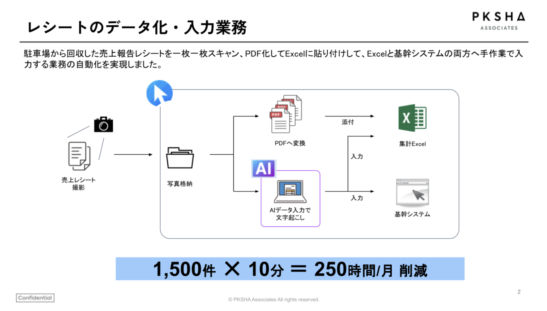 駐車場から回収した売上報告のレシートを、一枚一枚スキャンしてPDF化し、ExcelにPDFを貼り付けて転記・基幹システムへも入力していました。