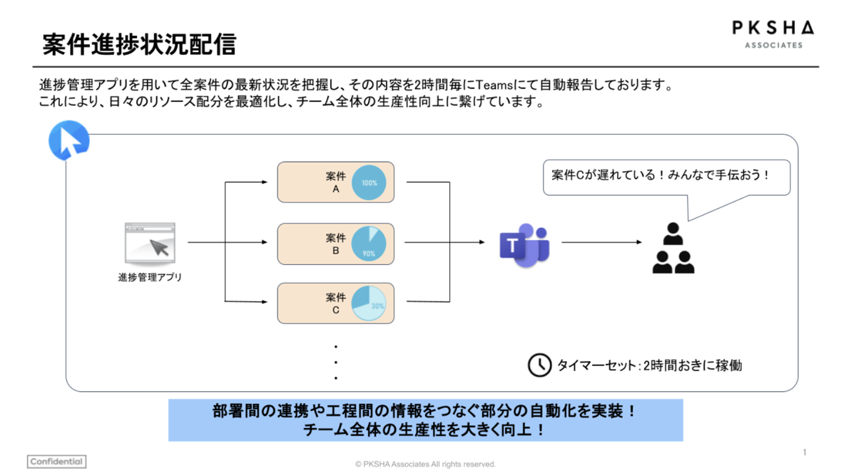 各案件の進捗状況を2時間おきにチャットへ自動投稿させるロボットは、今や不可欠な存在です。以前は担当者が手動で報告していましたが、今ではロボットが正確に知らせてくれる。これにより、メンバーはPCを開く前からスマホで状況を把握し、「次はこれをやらなきゃ」「あそこが滞っているから手伝おう」といった次のアクションを事前に考えられるようになりました。この小さな変化が、チーム全体の生産性を大きく向上させています。